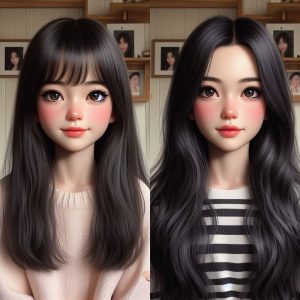 Ela me deu algumas roupas e pediu para tirar algumas fotos. Disse que trabalha com imagens, fotos e afins. Neste ano, isso era muito comum: todo mundo pegava o celular, colocava um filtro no rosto e ficava bonito, mas todos pareciam diferentes. Ela passou algo no meu rosto, e quando olhei no espelho, estava quase irreconhecível, mas estava gostando e me divertindo. Tiramos algumas fotos. Ela explicou que, usando uma técnica, conseguia deixar as pessoas diferentes e quase irreconhecíveis, por isso estou tão diferente. Pena que não pude ficar mais tempo; a mulher de vermelho disse que é proibido ir para o futuro, então tenho que ir. “Tchau, moça! Gostei de conhecer você. Espero te ver novamente.” Vejam as fotos que tiramos. Aproveitei e coloquei algumas fotos de Pix em suas duas versões. E antes de ir, qual é o seu nome? Moça grande? Meu nome é… A Geo fica assombrada com a resposta e dá um sorriso! Veja.
